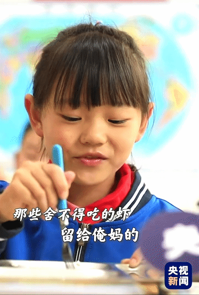 8岁女孩张笑笑在学校吃午餐时,唯独留下了盘子里的虾,一句“留给俺妈”戳中无数人的心。