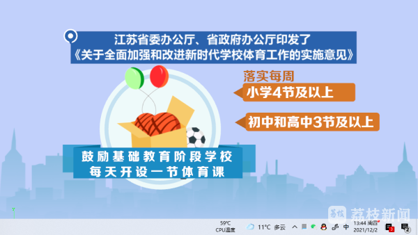 今年3月,江苏省体育局和江苏省教育厅联合发布《关于深化体教融合促进青少年健康发展的实施意见》强调,体育课不再为文化课"让道"。今年11月,江苏省委办公厅、省政府办公厅印发了《关于全面加强和改进新时代学校体育工作的实施意见》,鼓励基础教育阶段学校每天开设一节体育课,落实每周小学4节及以上、初中和高中3节及以上体育课。