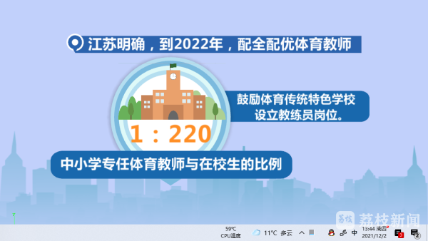 江苏明确,到2022年,配全配优体育教师,中小学专任体育教师与在校生的比例达1:220,鼓励体育传统特色学校设立教练员岗位。