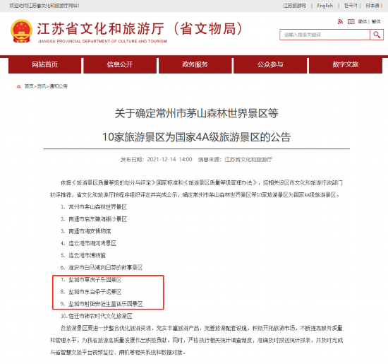 12月14日,江苏省文旅厅发布通知,确定10家景区为国家4A级旅游景区,盐城市3家景区入选,分别是: