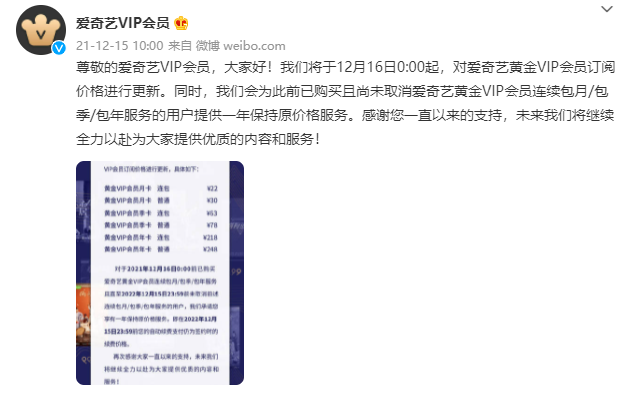 荔枝新闻讯 爱奇艺VIP会员微博消息,尊敬的爱奇艺VIP会员,大家好!我们将于12月16日0:00起,对爱奇艺黄金VIP会员订阅价格进行更新。同时,我们会为此前已购买且尚未取消爱奇艺黄金VIP会员连续包月/包季/包年服务的用户提供一年保持原价格服务。感谢您一直以来的支持,未来我们将继续全力以赴为大家提供优质的内容和服务!