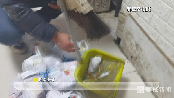 不光是商家不注意卫生,现场的一些外卖小哥可能是接单太多,也把拿不下的外卖丢在脏兮兮的地面上。
