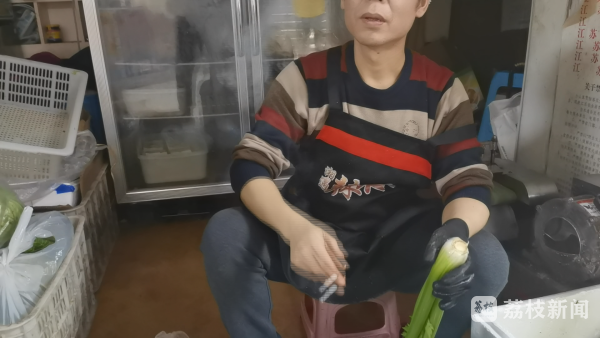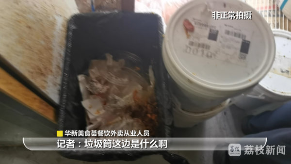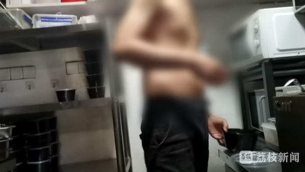 员工赤膊上阵不戴口罩 厨房垃圾桶无遮盖