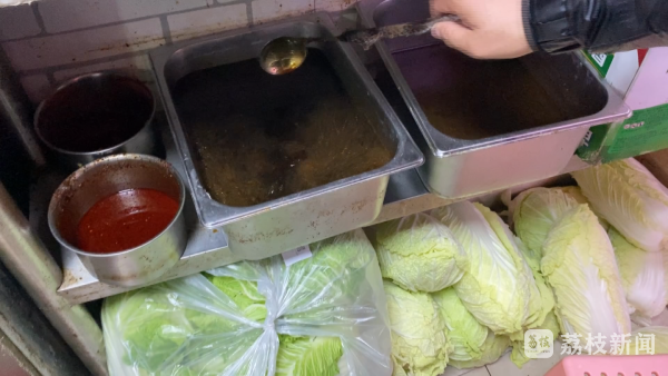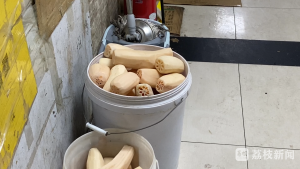 中午11点左右,记者跟随外卖小哥进入这家美食荟,此时各家店的餐饮从业人员都在忙碌着。记者粗略数了一下,几百平米的空间里,大约有三十多家各类餐饮外卖商家,由于空间狭小,很多店铺都没有专门的原料储藏间,食材摆放混乱,洗好的藕与拖把摆在一起,酱料则摆在人来人往的过道上,没有任何遮盖。