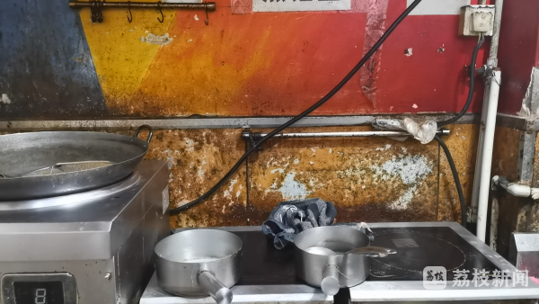 这些商家的后厨又是如何呢?记者走进这家"宝哥猪肚鸡汤饭"的后厨,只见墙壁和地面上满是油污,有的地方已经发霉变黑,而边上就是各种食材。