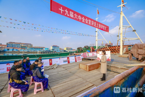 以新思想定向领航、向新思想寻策问道。一场场生动的宣讲凝聚起强大精神力量。在船头,黄沙港镇镇长常敏向渔民们分享学习体会、感悟时表示:“通过丰富多彩的宣讲形式,把党的十九届六中全会精神带到群众身边,让群众更加深刻的领悟国家的方针政策,更有心、有情、有味的把全会精神带到群众的心坎里,激励广大干群投身国际化、旅游型渔港小镇建设。”