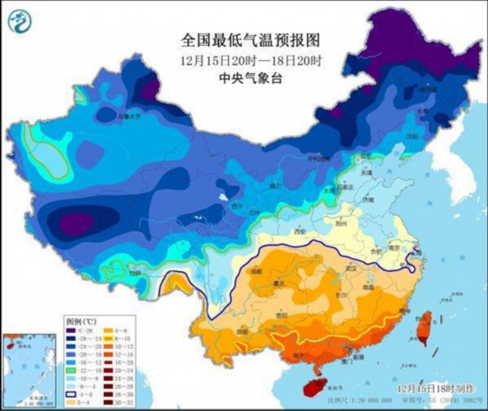 中央气象台12月15日18时发布寒潮蓝色预警:受冷空气影响,预计,12月15日20时至18日20时,我国中东部大部地区将降温6~10℃,其中,吉林东南部、安徽东部、江苏大部、上海西部、浙江大部等地降温幅度可达12℃以上。12月18日早晨最低气温0℃线位于江南东北部至四川盆地北部一带。内蒙古、东北地区、华北等地有4~5级偏北风,阵风6~8级;我国东部和南部海域将有7~8级风,阵风9~10级。