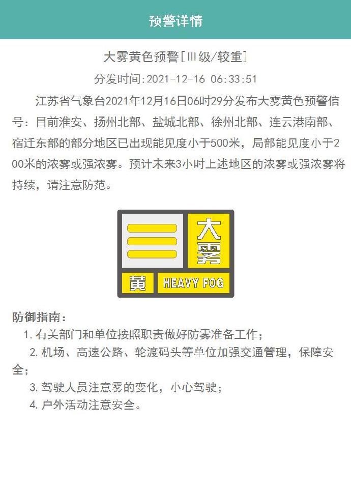 江苏省气象台2021年12月16日06时29分发布大雾黄色预警信号:目前淮安、扬州北部、盐城北部、徐州北部、连云港南部、宿迁东部的部分地区已出现能见度小于500米,局部能见度小于200米的浓雾或强浓雾。预计未来3小时上述地区的浓雾或强浓雾将持续,请注意防范。