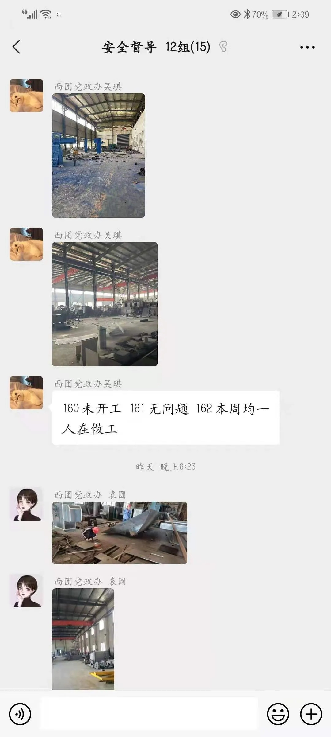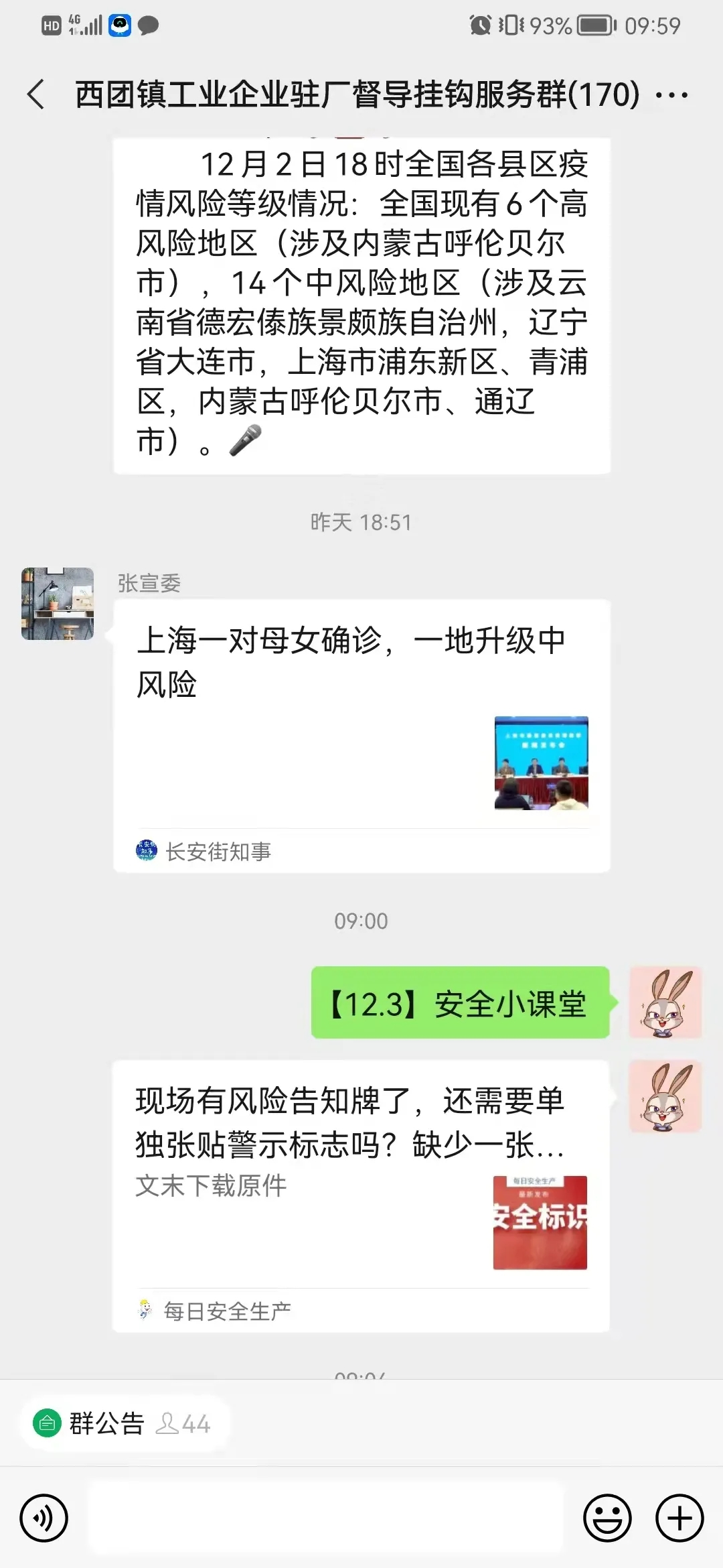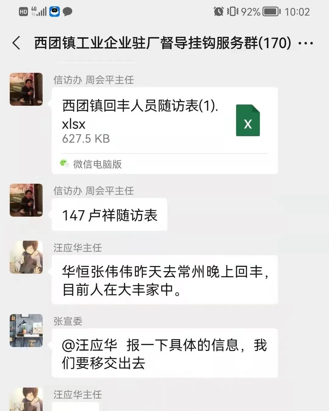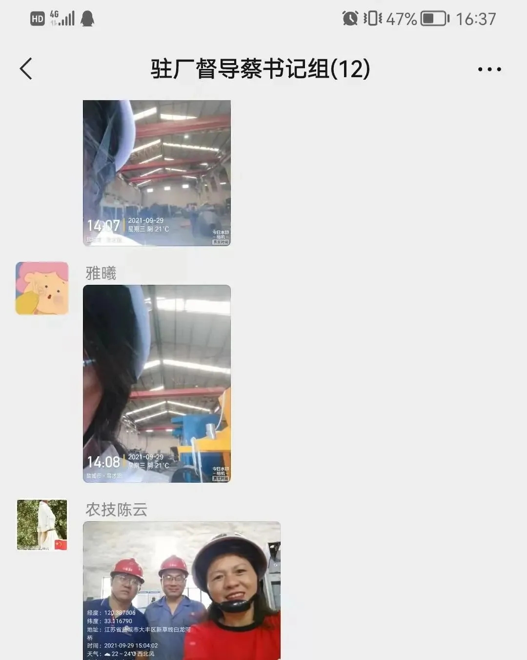 12月13日下午3点多,大丰区西团镇驻厂督导员第8组微信群里信息不断,一张张督导“打卡”照片陆续上传。副镇长李蓉蓉点开一张照片向记者介绍道:“这是我镇信访办主任周会平在久昌机械有限公司开展督导的实时照片。检查企业安全生产、疫情防控措施是否落实到位,了解企业运行状况以及有哪些服务诉求,是老周日复一日的‘必修课’。”如今,一支由15位镇班子成员、118 名机关干部、13个村(居)书记组成的驻厂督导员队伍正活跃在该镇工业战线上,为辖区308家工贸企业开展零距离、保姆式服务。