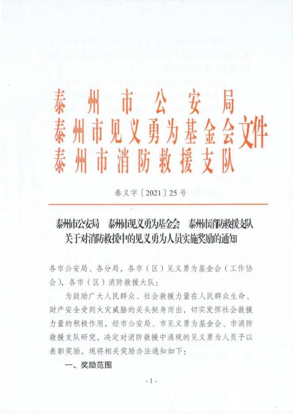 会上,泰州市公安局、泰州市见义勇为基金会、泰州市消防救援支队联合下发了《消防救援见义勇为人员奖励实施办法》。《办法》规定了三类人员符合奖励范围,分别是消防救援指战员、政府专职消防队员等负有法定职责、法定义务的人员,在非工作时间、非职责范围内,实施灭火救援、救人等行为的;微型消防站队员等负有约定义务的人员,在非工作时间、非约定义务区域,实施灭火救援、救人等行为的;不负有法定职责、法定义务或者约定义务的广大人民群众,实施灭火救援、救人等行为的。