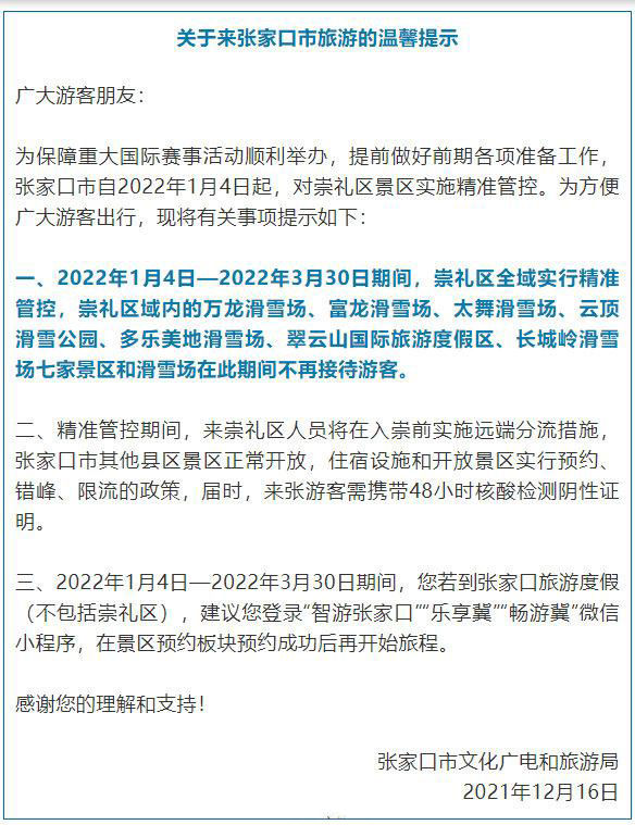 一、2022年1月4日—2022年3月30日期间,崇礼区全域实行精准管控,崇礼区域内的万龙滑雪场、富龙滑雪场、太舞滑雪场、云顶滑雪公园、多乐美地滑雪场、翠云山国际旅游度假区、长城岭滑雪场七家景区和滑雪场在此期间不再接待游客。