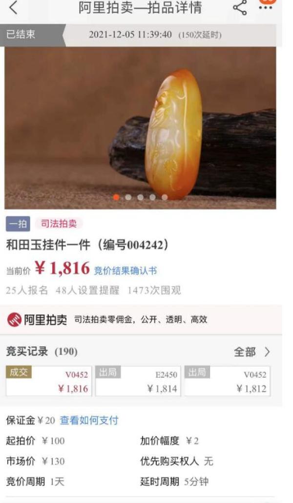 记者注意到,这是一件来自高邮法院的拍品,在拍卖页面,该和田玉挂件显示有25人报名,1417次围观。拍卖从12月4日上午10:00开始,加价幅度为2元。在拍卖开始的前7轮竞价中,各竞买人都比较“谦让”,每次加价幅度为2元,前7轮竞价结束,价格为114元。到了第8轮,竞买人突然加价,将竞拍价格提升到了200元,一举突破市场估价。然而并没有结束,之后,竞买人们一路你追我赶,将价格不断抬升。