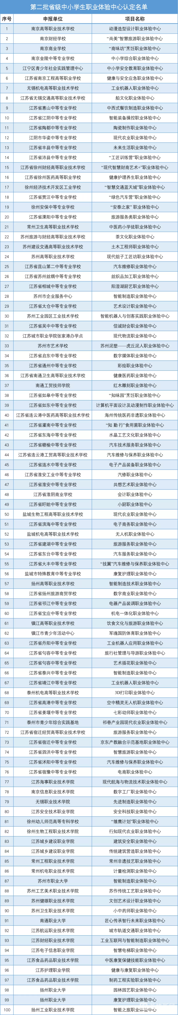 记者今天(12月17日)从江苏省教育厅获悉,根据相关文件要求,经申报单位自我测评、市级推荐,省教育厅组织专家审核并网上公示,现认定南京高等职业技术学校“动漫造型设计职业体验中心”等100个职业体验中心为第二批省级中小学生职业体验中心。