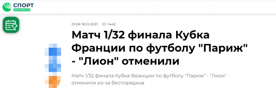 俄新社:法国杯足球赛“巴黎”(足球俱乐部)与“里昂”队进行的1/23决赛被取消