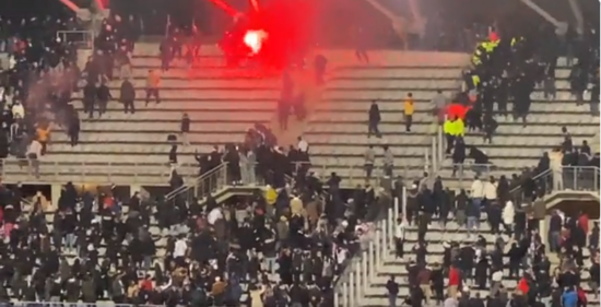 法新社报道称,两个球队的球迷相互扔燃烧物,还有人点燃自制烟花。俄新社援引的社交媒体上的一段视频显示,现场一片混乱,还有烟雾产生。