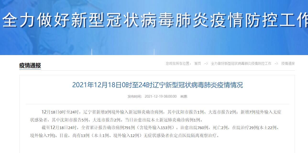 荔枝新闻讯 据辽宁省卫健委网站消息,12月18日0时至24时,辽宁省新增3例境外输入新冠肺炎确诊病例,其中沈阳市报告1例、大连市报告2例;新增7例境外输入无症状感染者,其中沈阳市报告5例、大连市报告2例。当日治愈出院本土新冠肺炎确诊病例1例。