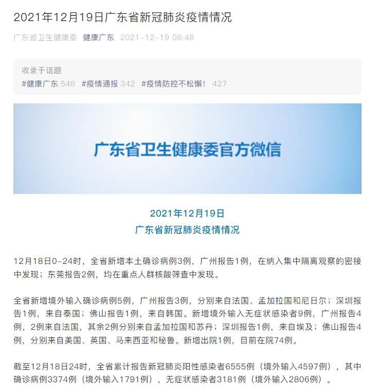 荔枝新闻讯 据“健康广东”微信公众号消息,12月18日0-24时,广东省新增本土确诊病例3例,广州报告1例,在纳入集中隔离观察的密接中发现;东莞报告2例,均在重点人群核酸筛查中发现。