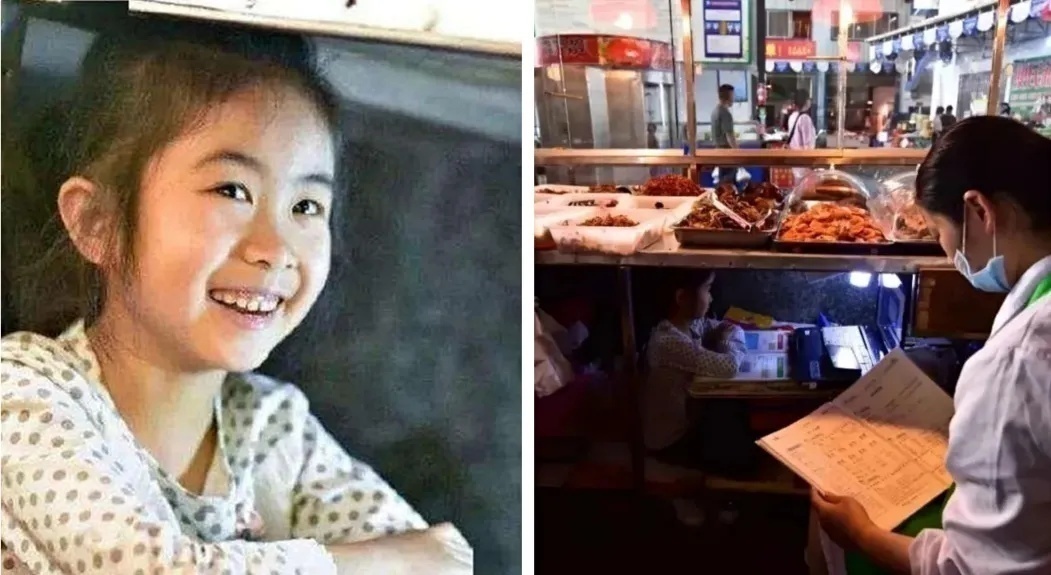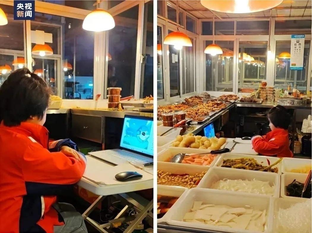 一个小女孩坐在父母工作的案板下,神情专注地上网课。她的眼睛因梦想而闪闪发亮,戳中无数网友。