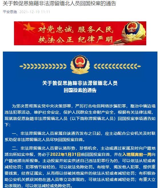 为坚决贯彻落实党中央决策部署,严厉打击电信网络诈骗犯罪,整治中缅边境违法犯罪活动,维护社会安定,保护人民群众生命财产安全,根据有关法律法规,现就敦促恩施籍非法滞留缅北人员(以下简称滞留缅北人员)回国投案事项通告如下: