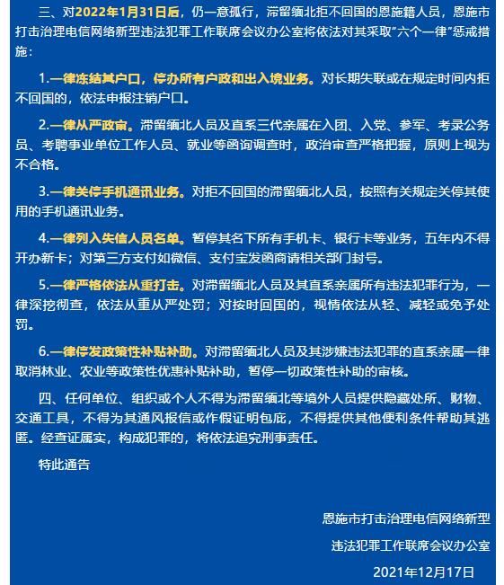 三、对2022年1月31日后,仍一意孤行,滞留缅北拒不回国的恩施籍人员,恩施市打击治理电信网络新型违法犯罪工作联席会议办公室将依法对其采取“六个一律”惩戒措施: