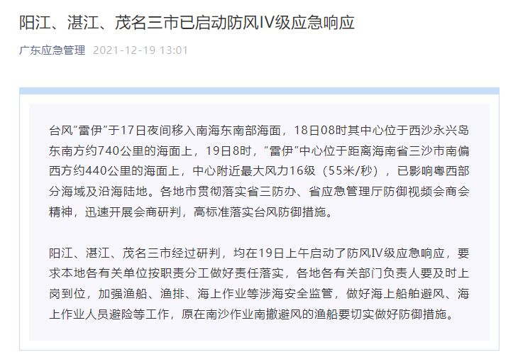 阳江、湛江、茂名三市经过研判,均在19日上午启动了防风Ⅳ级应急响应,要求本地各有关单位按职责分工做好责任落实,各地各有关部门负责人要及时上岗到位,加强渔船、渔排、海上作业等涉海安全监管,做好海上船舶避风、海上作业人员避险等工作,原在南沙作业南撤避风的渔船要切实做好防御措施。