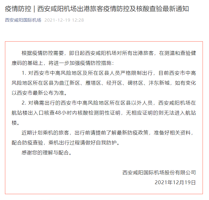 荔枝新闻讯 12月19日,“西安咸阳国际机场”微信公众号发布西安咸阳机场出港旅客疫情防控及核酸查验最新通知。通知全文如下: