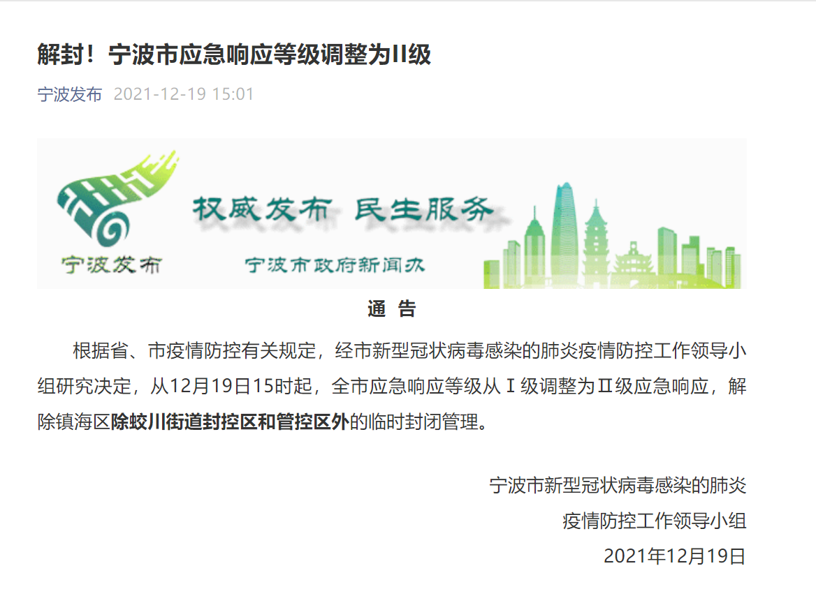 根据省、市疫情防控有关规定,经市新型冠状病毒感染的肺炎疫情防控工作领导小组研究决定,从12月19日15时起,全市应急响应等级从Ⅰ级调整为Ⅱ级应急响应,解除镇海区除蛟川街道封控区和管控区外的临时封闭管理。