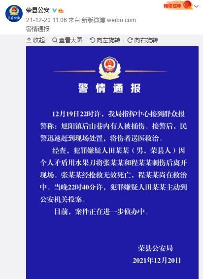 荔枝新闻讯 四川省自贡市荣县公安局官方微博12月20日发布通报称,12月19日22时许,荣县公安局指挥中心接到群众报警称:旭阳镇后山巷内有人被捅伤。接警后,民警迅速赶到现场处置,将伤者送医救治。