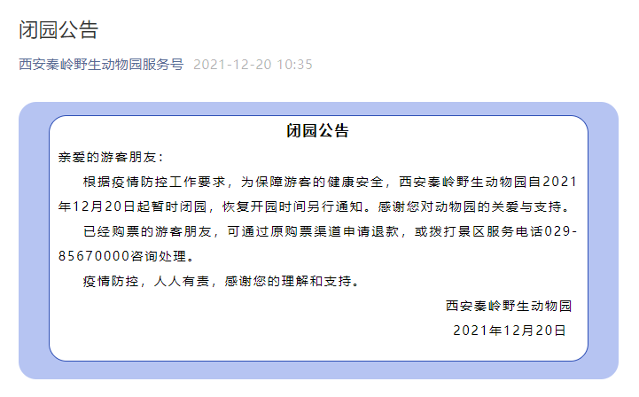荔枝新闻讯 12月20日,秦岭野生动物园发布公告:根据疫情防控工作要求,为保障游客的健康安全,西安秦岭野生动物园自2021年12月20日起暂时闭园,恢复开园时间另行通知。