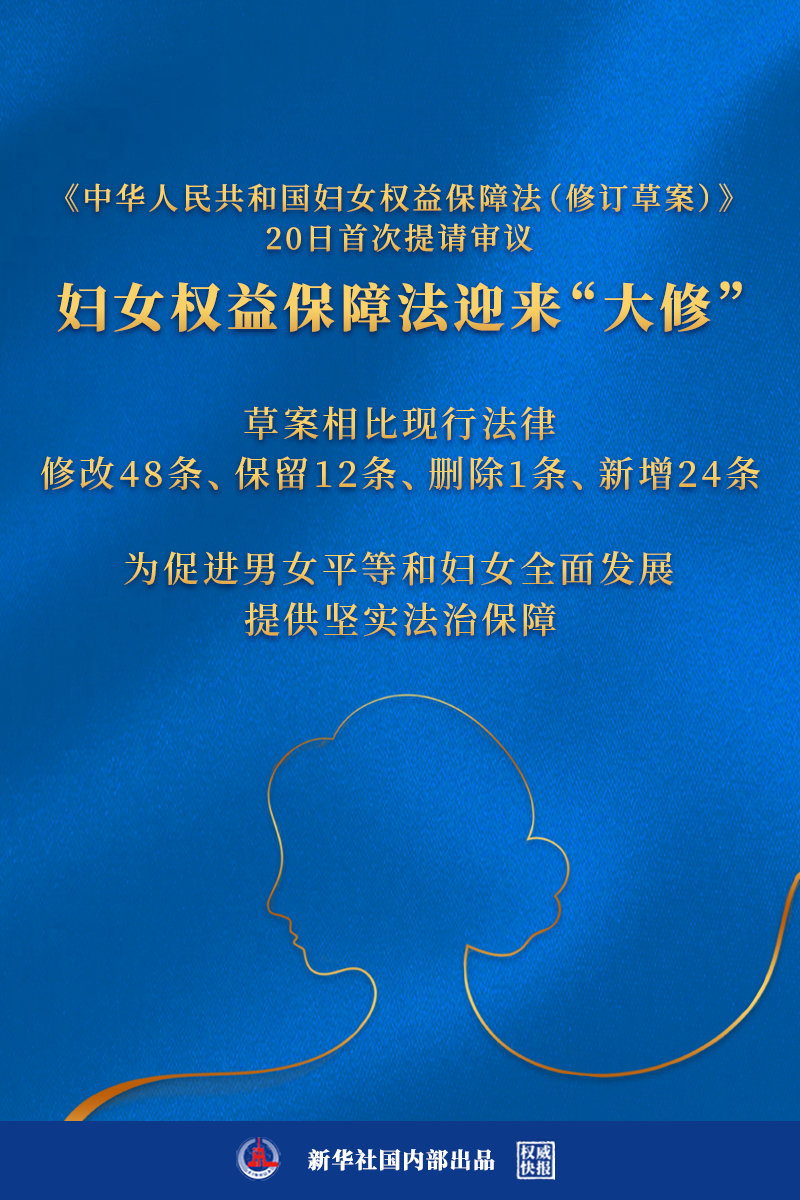 妇女权益保障法修订草案20日提请全国人大常委会会议审议,这是该法施行近30年来又一次进行重大调整。草案明确,国家采取必要措施,逐步完善保障妇女权益的各项制度,消除对妇女一切形式的歧视,禁止基于性别排斥、限制妇女依法享有和行使各项权益。草案针对教育就业领域的性别歧视作出规定,完善性骚扰的预防和制止措施,对离婚时家务劳动经济补偿增加规定……戳大图速览!