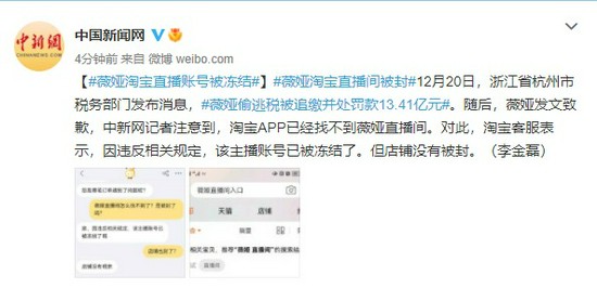 12月20日,浙江省杭州市税务部门发布消息,薇娅偷逃税被追缴并处罚款13.41亿元。随后,薇娅发文致歉,中新网记者注意到,淘宝APP已经找不到薇娅直播间。对此,淘宝客服表示,因违反相关规定,该主播账号已被冻结了。但店铺没有被封。(李金磊)