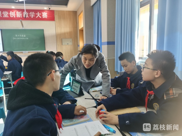 “这三个图形从形状上来看,哪个更接近正方形?有一种解决方法,两种解决方法,三种解决方法......”镇江外国语学校老师蒋云给大家展示了初一数学课《数学活动-设计包装箱》,当蒋云在交互式电子屏幕上提出,设计两盒牛奶的包装箱如何使材料尽可能少时,学生们5-6人为一个小组,迅速通过手中的ipad寻找各自的解决路径,互相探讨。