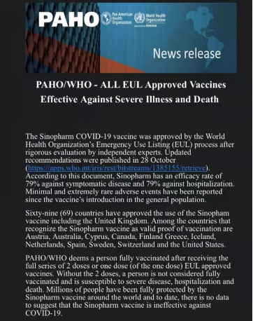 泛美卫生组织 (PAHO)也针对国药疫苗效力情况发布声明称,国药疫苗已经被世界卫生组织列入紧急使用清单。全球已有数以百万计的人受到国药疫苗的全面保护,迄今为止,尚无数据表明国药疫苗对新冠病毒无效。
