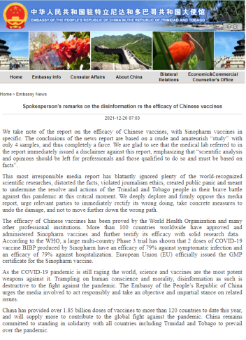 同日,特多外交部长埃默里·布朗也发文批评称,《每日快报》报道的是一种不科学、懒惰、草率、不合逻辑、危险和误导性的观察结果,该结果被粗暴地解释为“对世卫组织批准的 新冠疫苗有效性的测试”。12月9日,在中国政府援助特多政府抗疫物资交接仪式中,布朗赞赏中方为全球抗疫和可持续发展所作重要贡献,代表特多政府衷心感谢中方长期给予无私帮助,特别是在特多抗疫最孤立无援的时刻及时援助大量珍贵疫苗,他表示,中方捐赠的新一批抗疫物资将为特多人民的生命健康和安全提供更大保障,展现出中方“言必信、行必果”的大国担当。