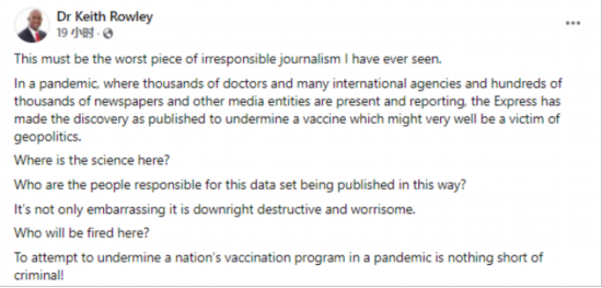 《每日快报》缺乏科学依据、以攻击中国疫苗为目的的报道随即遭到特多各方的批评与反对。该国总理罗利19日在社交媒体上连发两篇文字,称《每日快报》的报道是他见过“最糟糕且不负责任的新闻”。罗利批评称,这样一篇报道让国药疫苗成为地缘政治的受害者,而在新冠大流行中破坏一个国家的疫苗接种计划“简直就是犯罪”,《每日快报》必须要站出来承认错误,并呼吁弱势群体不要根据这篇“危险文章”作出是否要接种疫苗的决定。
