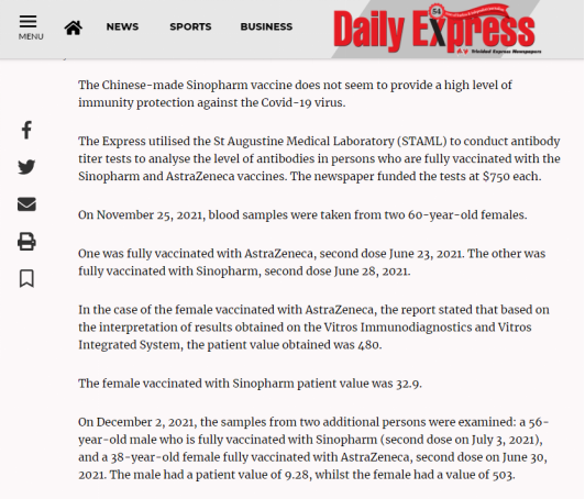 《每日快报》的报道在开头即给出结论称,“中国制造的国药疫苗似乎不能提供针对新冠病毒的高水平免疫保护。”为证明这一说法,《每日快报》称其通过该国的圣奥古斯丁医学实验室(STAML)对4名疫苗接种者进行中和抗体滴度测试。结果显示,已接种阿斯利康疫苗的2人体内的“中和抗体滴度高于接种国药疫苗的2人”。