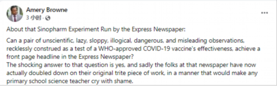 与此同时,《每日快报》还采访了3名匿名医生,这些医生说,他们遇到的大多数有症状新冠患者“或是未接种疫苗,或是已接种国药疫苗”。其中一名医生宣称,他曾遇到“完成两针国药疫苗接种但仍病情严重的患者”。该报记者还电话采访了英国国家医疗服务体系(NHS)顾问、免疫学者史蒂芬·敏特。敏特认为“国药疫苗的数据不足,最好的疫苗是mRNA疫苗”。