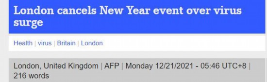 【环球网报道】据法新社报道,由于担心新冠病毒奥密克戎变异株引起感染病例激增,伦敦市长萨迪克汗当地时间20日称,该市将取消一项重要新年庆祝活动。