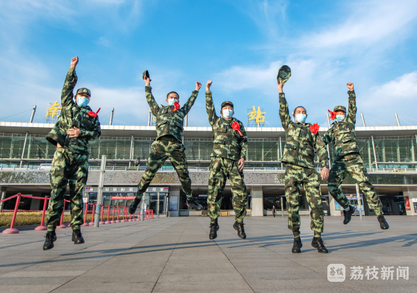 因为送别地点是在南京站,在拍摄中,左毅也格外注意南京站元素的呈现。其中一幅作品,5名新兵在镜头前高高跃起,挥舞手中的军帽,背景正是整治出新后的南京站站房平台。别致的“镜面风动幕墙”在微风中起伏,宛如粼粼波光,为船形的南京站站房建筑增加一份“水韵”。