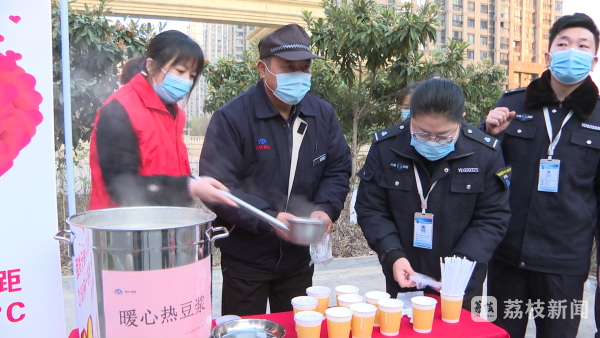 在盐城市盐都区,参与"暖冬行动"的爱心志愿者们一大早就来到社区,为居民们送来了热豆浆。