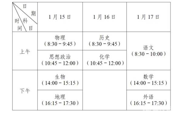 江苏省2022年普通高中学业水平合格性考试将于2022年1月8日开始,其中,信息技术科目(机考)考试1月8-10日,每天6场,每场60分钟,每场间隔30分钟。语文、数学、外语、思想政治、历史、地理、物理、化学、生物科目(笔试)考试:2022年1月15-17日。除语文科目考试时长为90分钟外,其他各科均为75分钟。