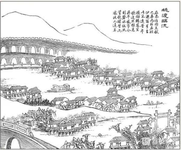 清代《金陵四十八景》第二十二景《桃渡临流》中,远处以东水关为背景。