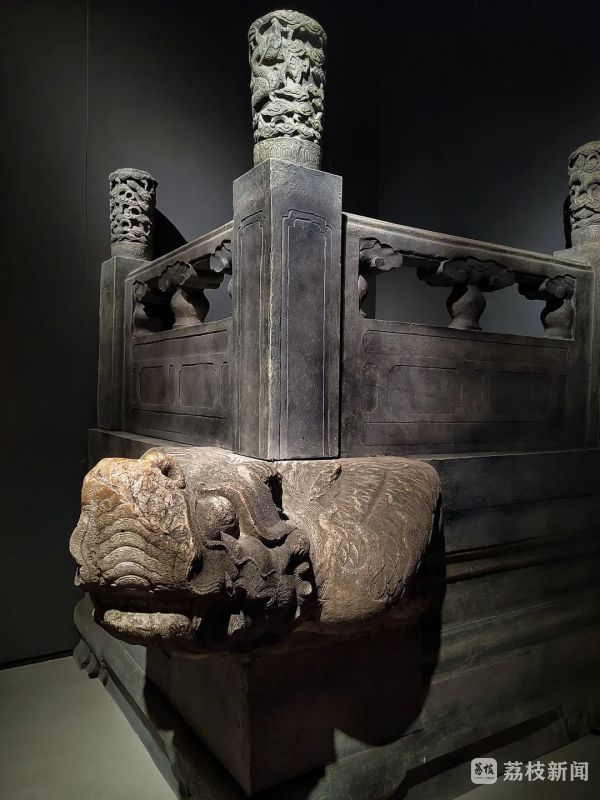 在明故宫展示版块的转角,鱼龙造型的石栏杆十分引人注目。整个栏杆的灰色中都呈现出新建博物馆的崭新气息,唯独中间神兽造型的石雕泛着微黄,带有一丝岁月的痕迹。新的构筑件与文物交相辉映,曾经散落在午门公园地面上的石刻,展示出了自己应在的位置,其建筑结构得以复原,作用价值一目了然。这,正是来自明故宫奉天殿的石螭首。