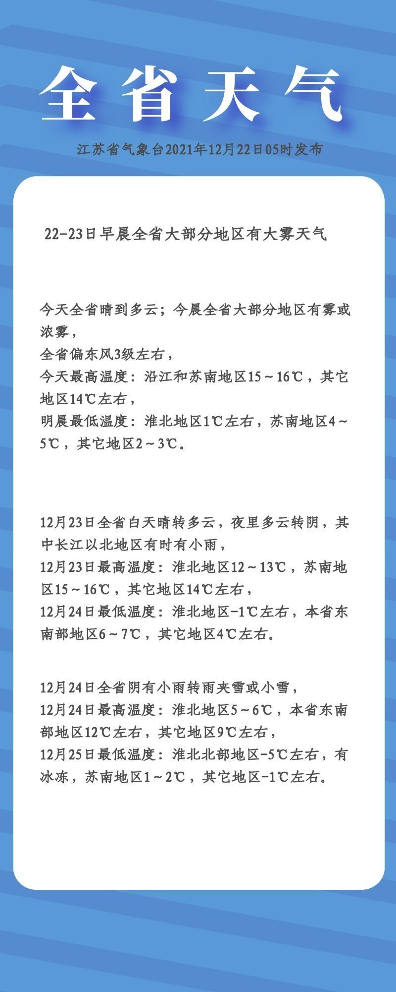 据@江苏气象消息, 今天全省晴到多云;今晨全省大部分地区有雾或浓雾,全省偏东风3级左右,今天最高温度:沿江和苏南地区15~16℃,其它地区14℃左右,明晨最低温度:淮北地区1℃左右,苏南地区4~5℃,其它地区2~3℃。