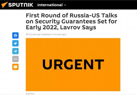 俄罗斯卫星通讯社刚刚消息,俄罗斯外长拉夫罗夫称,俄美首轮安全保障谈判将于2022年初举行。