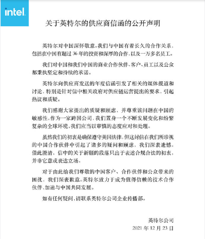 荔枝新闻讯 23日,英特尔就其涉疆言论表示道歉。