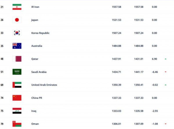 伊朗(21)与日本(26)这两支亚洲劲旅进入世界前30。进入亚洲前十的还包括韩国(33)、澳大利亚(35)、卡塔尔(48)、沙特(51)、阿联酋(69)、中国(74)、伊拉克(75)、阿曼(79)。