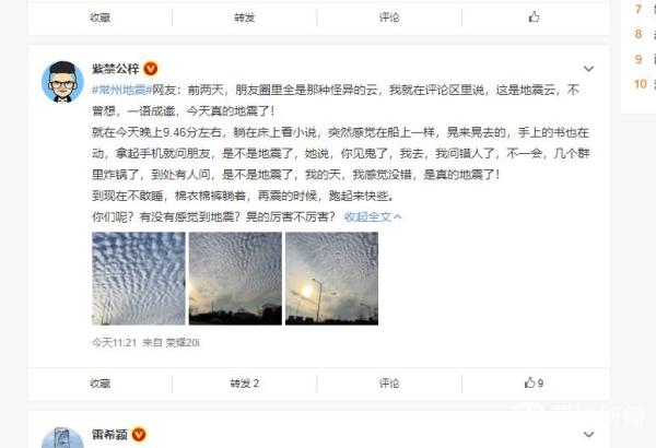 杨云表示,近期常州地区不排除发生2到3级地震的可能性,再次发生4级或者更大级别地震的可能性很小。常州地震发生后,不少网友表示,他们此前在常州周边地市拍摄到奇怪的云,怀疑这些云就是传说中的地震云,这些云似乎预示着此次地震会发生,杨云说从专业上没有地震云这个说法,包括气象专业、地震和地质专业都没有这个说法,但是一些民间爱好者或者研究的人,以这种地震云做所谓的地震预报。