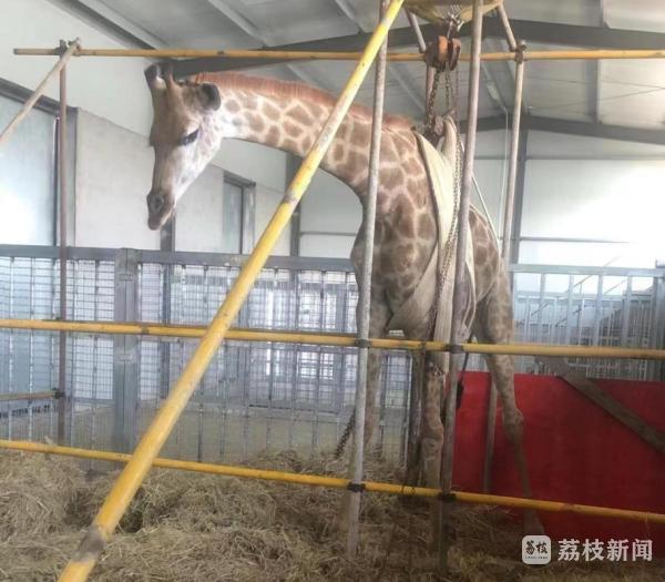 据悉,这只受伤长颈鹿是一只四岁左右的成年长颈鹿,身高有5米多高,前几日就因为在笼舍里和小伙伴玩耍时左腿不慎碰到笼舍围栏后受伤。这次事发时,长颈鹿趴下休息后,想再次站立起来,由于伤腿支撑无力,导致无法站起来而瘫躺在地上。当发现长颈鹿倒地后,园区相关部门立即采取救护措施,先搭建脚手架,然后把滑轮固定在脚手架上,用绷带固定长颈鹿,将长颈鹿从地上拉起。