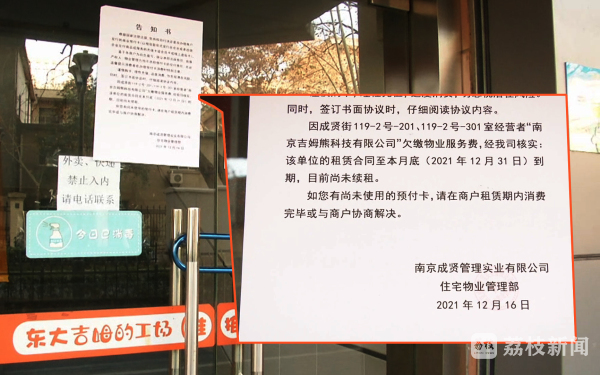 12月21日上午,记者来到位于南京市成贤街的吉姆的工场教学点,这里并没有对外营业,不仅大门紧锁,而且在玻璃门上贴着一张物业公司的告知书:南京吉姆熊科技有限公司欠缴物业服务费,租赁合同2021年12月31日到期,尚未续租。